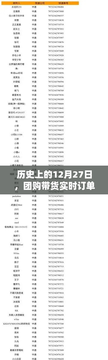 在探討團購帶貨實時訂單查詢之前,我們先來回顧一下歷史上的12月27日發(fā)生了哪些重要事件,這一天可能有著特殊的購物節(jié)日或者重要的商業(yè)活動,引發(fā)了大量的團購帶貨活動,了解這些背景信息有助于我們更好地理解實時訂單查詢的重要性。