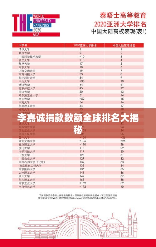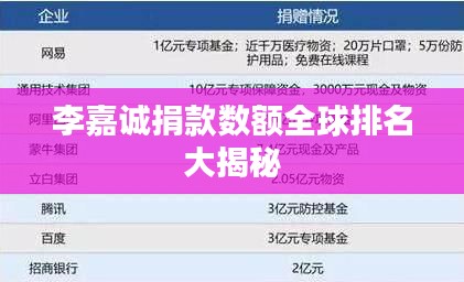 根據(jù)最新的全球富豪捐款排行榜,李嘉誠的捐款總額位列全球前列,他的善舉不僅在中國內(nèi)地和香港地區(qū)廣為人知,還受到了國際社會(huì)的廣泛關(guān)注和贊譽(yù),他的捐款行為不僅體現(xiàn)了他的社會(huì)責(zé)任感,也展示了他的國際影響力。