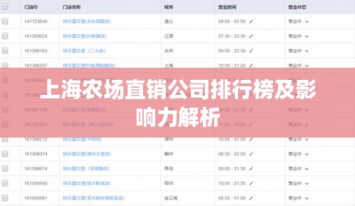 在當(dāng)今社會(huì),食品安全與健康日益受到人們的關(guān)注,農(nóng)場(chǎng)直銷模式的興起,為消費(fèi)者帶來了更為新鮮、安全的食品,上海,這座繁華的國際大都市,其農(nóng)場(chǎng)直銷業(yè)務(wù)也發(fā)展得風(fēng)生水起,本文將探討上海農(nóng)場(chǎng)直銷公司的排名及其影響力。